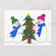 Une scène enneigée amusante où deux petits bonhommes de neige mettent des ornements sur un sapin de Noël.