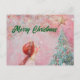Une carte postale de Noël quand vous êtes en déplacement et voulez envoyer un message de voeux de vacances. L'illustration principale montre un arbre de Noël et une jeune femme aux cheveux rouges. Le texte en avant dit : Joyeux Noël. Le texte en arrière dit : Et une Bonne Année.
