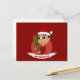 Carte postale avec l'illustration d'un joli garçon heureux souriant, il porte un costume de Père Noël rouge et blanc et tient un cadeau; avec le texte modifiable modèle pour votre nom ou message, Noël design avec un arrière - plan rouge