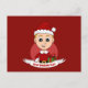 Carte postale avec l'illustration d'un joli garçon aux cheveux blonds souriants et joyeux, il porte un costume de Père Noël rouge et blanc et tient un cadeau; avec le texte modifiable modèle pour votre nom ou message, Noël design avec un arrière - plan rouge