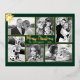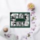 Cartes postales de Noël en feuille d'or avec six modèles photo. Les cadres et le texte sont en feuille, tout comme le flocon de neige dans le coin supérieur. L'or est montré, avec deux autres couleurs à choisir. Ajoutez des photos de la famille et des animaux de compagnie en orientation horizontale, verticale et carré. Votre photo remplira chaque modèle. Les images entourent le texte central. Ajoutez un message de bienvenue et une signature préférés. La couleur arrière - plan vert foncé de la forêt fonctionne avec des images couleur ou noir et blanc. Le dos de la carte contient des lignes pour les adresses d'écriture sur un arrière - plan de flocon de neige.