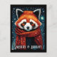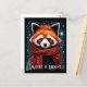 Un mignon panda rouge avec une écharpe sur la carte postale de l'arrière - plan de nuit enneigé.