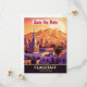 Invitation de mariage à Flagstaff avec carte postale de voyage. Ligne d'horizon de la ville et montagne en arrière-plan.