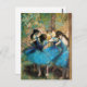 Carte postale Degas Blue Dancers. Peinture à l'huile des années 1880. Le peintre français Edgar Degas était l'un des grands impressionnistes de sa génération. Les peintures Ballet de Degas sont célèbres pour leur sens de la grâce, du mouvement et de la subtile couleur. Blue Dancers est l'un des tableaux les plus aimés de Degas et présente de jolies ballerines serrées les unes contre les autres fixant leurs cheveux et robes. Un grand cadeau pour les fans de Degas, Impressionnisme, Ballet et peintures de danse.