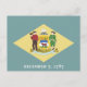 Celebrate Delaware, The First State, with this historic Delaware State Flag postcard! Featuring the distinctive colonial blue field with a buff-colored diamond at its center. The focal point is the detailed Delaware Coat of Arms, depicting a farmer and a militiaman, representing the state's agriculture and defense. A ship symbolizes its coastal commerce, while a sheaf of wheat and an ear of corn highlight its bountiful harvest. Below, the significant date "DECEMBER 7, 1787" proudly marks its ratification of the U.S. Constitution.
