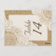 Elégante dentelle blanche sur burlap numéro de table mariage carte postale avec dentelle blanche sur le lin burlap naturel ou hessian qui couvre deux coins d'un rectangle blanc avec bordure de burlap beige. Texte en marron. Notez que la dentelle et le burlap sont tous "imprimés" et non de vrais tissus. Ce design élégant, sophistiqué et romantique à l'essence rustique fait partie d'un ensemble mariage et est parfait pour un pays chic ou occidental printemps, été ou automne/automne mariage avec une palette de couleurs neutres.