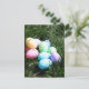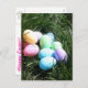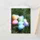 Cette carte postale contient des oeufs de Pâques dans l'herbe. Sur le dos, il est écrit "Joyeux Pâques !" en police rose.