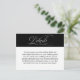 Une élégante carte d'enceinte à envoyer avec vos invitations de mariage, cette carte de détails a le texte titre en belle calligraphie argentée sur un arrière - plan noir contrasté avec un modèle texte pour inclure des détails importants pour vos invités mariages. Incluez toutes les informations que vous souhaitez transmettre à vos invités, c'est-à-dire les informations sur l'hôtel, les itinéraires routiers, les événements spéciaux ou les rassemblements pendant votre semaine de mariage, votre site Web mariage ou toute autre information que vous souhaitez fournir à vos invités. Entrez votre texte à la place de l'exemple de texte. Si vous devez repositionner le texte pour le centrer, ou modifier la taille de la police/police, choisissez "customiser plus loin". Vous pouvez faire glisser le texte à l'emplacement souhaité pour le recentrer.