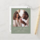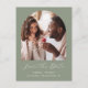 Cette carte postale simple et minimaliste Save the Date présente une photo en arc au-dessus des mots "Save the Date" dans un élégant script d'écriture manuscrite blanche, suivie des noms du couple, de la date mariage et de la ville en caractères sans serif sur un arrière - plan vert sage. Ajoutez une deuxième photo horizontale rectangulaire au dos, ainsi que votre adresse de retour et le texte supplémentaire avec plus d'informations ou de détails.