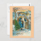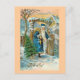 Jolie carte de Noël suédoise montrant le Père Noël arrivant à une porte de jardin avec un grand sac de cadeaux et de jouets.