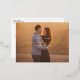 Cette photo élégamment minimaliste enregistrer la date dispose d'un script décontracté et une grande photo. Sur le devant de la carte postale, "Save the date" est écrit en simple calligraphie de feuille d'or. Le nom du couple est écrit en blanc au-dessus du script, et la date et l'emplacement du mariage sont écrits en dessous du script. La conception de typographie recouvre une photo horizontale à fond vif (orientation paysage). Des détails mariages supplémentaires (y compris le site Web du mariage) peuvent être ajoutés au verso de la carte postale.