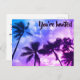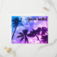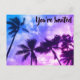 Cette carte postale d'invitation à une fête d'anniversaire présente une photo de palmiers. Le filtre utilisé donne aux arbres et au ciel une couleur violette et bleue amusante. Le texte de l'invitation peut être personnalisé pour votre événement.