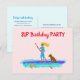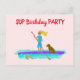 Carte postale d'invitation pour l'anniversaire d'une adolescente avec un thème de paddle debout. La conception illustrée montre une fille pagayant sur sa planche avec son chien à bord, tandis qu'une tortue de mer nage à côté. Personnalisez le texte du modèle sur le recto et le verso pour une fête de rassemblement. L'adresse de messagerie peut être ajoutée séparément à chaque invitation de fête.