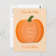 Cette carte postale "save the date" pour Baby Shower présente une image d'art numérique d'une citrouille orange mignonne avec 3 nuances différentes d'orange qui s'assombrissent vers les bords de la citrouille. Il y a une tige verte attachée au dessus. Le design est neutre en termes de sexe, ce qui en fait un design parfait pour célébrer un bébé garçon ou fille, surtout à Thanksgiving. Il y a un texte personnalisable pour que vous puissiez inclure la date de la Baby Shower et personnaliser le design comme vous le souhaitez.