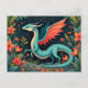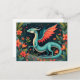Un petit dragon bleu-vert dans une jungle de minuit avec des fleurs orange vif fait une carte postale de fantaisie très mignonne et amusante.