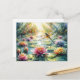 This postcard features a dragonfly gliding over a tranquil pond filled with blooming lotus flowers and lush lily pads. The nature-inspired scene glows with soft sunlight and vibrant botanical detail. Shades of pink, peach, lavender, green, and golden yellow blend beautifully, capturing the magical stillness of a summer morning by the water.