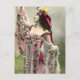 Une photo colorée vintage d'une jeune femme aux cheveux foncés vêtue d'une robe fleurie qui frappe une pose dramatique. Des fleurs couvrent aussi ses cheveux. Les couleurs sont rose clair et rose foncé avec une touche de jaune.