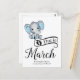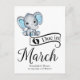 Adorable petit garçon éléphant avec des oreilles de pois bleu, typographie "Due en Mars", et modèle pour message spécial annonçant la grossesse.
