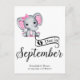 Adorable petit éléphant avec pois rose et petit arc rose au-dessus de l'oreille, typographie "Due en Septembre", et modèle pour message spécial annonçant la grossesse.