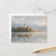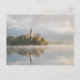 Carte postale d'un lever de soleil brumeux au lac Bled avec l'île avec l'église et brouillard avec réflexion dans l'eau à la première lumière du soleil du matin en Slovénie.