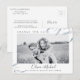 Moderne chic aquarelle bleu poussiéreux feuillage vert design avec photo en couple, simple et élégant, informez vos invités mariages de l'information mise à jour avec cette photo changer la date mariage carte de report, idéal pour mariage moderne, mariage rustique, et mariage de jardin botanique au printemps et en été.