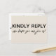 Dans le texte modifiable "gentiment répondre" a été placé, grand et gras, sur le devant. Dans une écriture décontractée moderne, un graphique représentant "Nous espérons que vous pouvez vous joindre à nous !" apparaît ci-dessous. Au verso, la même police unique a été utilisée pour créer des graphiques qui lisent "rsvp", "m" et "gentiment livrer à :" et tout autre texte est modifiable. Utilisez les champs modèle pour personnaliser autant que vous le souhaitez. L'avant a un arrière - plan élégant qui peut être changé à n'importe quelle couleur que vous préférez. // 100 //