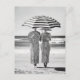 Deux femmes se tiennent pieds nus sur la plage, vêtues de robes rayées noires et blanches identiques, créant une harmonie visuelle saisissante. Ils tiennent des parapluies rayées et des casquettes assortis, se mêlant à l'audacieux jeu de motifs sur fond d'océan. Cette image surréaliste et à la mode capture la symétrie, le contraste et le style dans une scène balnéaire intemporelle.