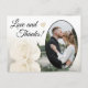 Cette belle carte postale est une façon simple mais soignée de remercier vos invités mariages. Il présente un joli design avec votre photo mariage dans un cadre ovale, et une seule longue tige d'ivoire ou rose blanche réfléchissant dans un bassin d'eau. La légende dit "Amour et Merci" et il y a de l'espace pour votre note personnalisée au dos ainsi que votre signature.