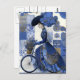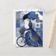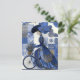 This unique image features a graceful lady in a vast blue hat and dress, riding a bicycle against a backdrop of blue and white ceramic tiles. Her flowing skirt and large floral adornments are rendered in a luxurious, patterned style with gold accents. The inclusion of the bicycle juxtaposes a modern element with the Delft-inspired Dutch aesthetic, creating a beautiful blend of historical fantasy and modern elegance.