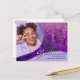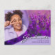 Une carte postale unique personnalisée de graduation photo, avec des éléments de design d'élégant script de style manuscrit avec du texte moderne. La photo des diplômés est rehaussée par de belles fleurs de lavande violette sur un arrière - plan violet. Le verso de la carte offre des espaces de texte personnalisés pour des informations sur la graduation et le futur voyage. Pour voir d'autres articles comme celui-ci, visitez mon magasin ici à "www.Zazzle.com/LakeViewCardCo". Merci