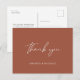Simple et moderne Calligraphie Script Merci Postcard en Terracotta à envoyer après votre mariage. Customisez-le avec vos propres noms sur le devant et le message au verso ou supprimez le texte au verso et ajoutez votre note manuscrite.