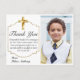 Merci à votre famille et à vos amis proches d'avoir assisté à la première sainte communion de votre fils ou de leur avoir généreusement fait un don en leur envoyant cette élégante croix d'or et cette carte postale blanche classique de Merci de la première sainte communion. Cette carte de remerciements de communion présente une jolie croix d'or dans un cadre doré contre un simple arrière - plan blanc traditionnel. Remplacez la photo par une image de votre enfant qui est présentée sur le côté droit de la sainte communion par carte postale.