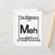La science a isolé un nouveau produit chimique dans le tableau périodique - l'élément d'indifférence, abrégé en MEH. Cette substance commune apparaît comme un haussement d'épaules verbal quand vous vous en moquez. Chimie d'argot pour les masses - un cadeau parfait pour... peu importe.