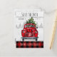 Famille d'Invitations et amis à votre fête de vacances avec cette carte postale personnalisée "Save The Date" invitation avec un camion rouge rétro avec un arbre de Noël à l'arrière. Personnalisez le texte dans la typographie noire moderne sur des planches de bois blanc rustique et du texte blanc sur un panneau de plaid de bûcheron rouge. Ajoutez toutes les informations pertinentes, y compris le nom de l'hôte de la fête de Noël, la date et l'année sur la couverture et l'adresse de retour, le jour, la date, l'année, l'heure, l'adresse du lieu et les détails de la RSVP, ainsi que l'espace pour écrire l'adresse de vos invités pour la livraison. Conçu par © Tim Coffey.