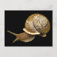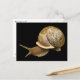Cette carte postale présente un escargot de jardin émergeant de sa coquille sur un arrière - plan noir. C'est un mollusque gastropode terrestre avec une coquille brune et beige dans le motif en spirale classique. Ses tentacules ont chacun un oeil à la fin et sont pointés en avant en découvrant où aller, poussés par son pied musclé fort.