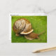 Cette carte postale présente un escargot de jardin émergeant de sa coquille sur une feuille verte. C'est un mollusque gastropode terrestre avec une coquille brune et beige dans le motif en spirale classique. Ses tentacules ont chacun un oeil à la fin et sont pointés en avant en découvrant où aller, poussés par son pied musclé fort.