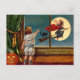 Une belle carte d'Halloween vintage avec un enfant regardant une sorcière volante à travers la fenêtre.