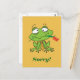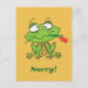 Grenouille caricaturale verte et drôle avec une tulipe dans la bouche.