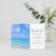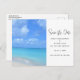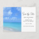 Save the date postcard with a scenic tropical photograph. A secluded beach with white sand and turquoise water.