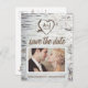 Birch Tree Rustic Wedding Save the Date Cards - dispose d'un arrière - plan d'écorce de bouleau avec un coeur pour sculpter vos propres initiales personnalisées à l'intérieur avec votre date de mariage. Changez le couple de démonstration en une photo de votre propre. Consultez la collection correspondante sur cette page pour terminer votre événement.