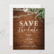 Save The Date présente des feuilles verdoyants et des lampes à cordes sur du bois rustique.