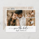 Élégant minimaliste tendance typographie moderne Script 3 Collage de photos Enregistrer les cartes de dates en noir et blanc. Ce design délicat est parfait pour un mariage moderne. Caractéristiques (trois) 3 grille photo collage, une calligraphie whimsical à la main lettré style swash queue police avec coeur d'amour. Le dos photo complète avec une superposition translucide, vous pouvez ajouter vos détails et informations de mariage. Facile à personnaliser avec vos détails et photos mariages.