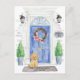 Annoncez votre nouvelle adresse avec notre faire-part élégante avec un caniche bronzé, une porte d'entrée bleue, un tapis de bienvenue, une ardoise, des topiaires et une couronne fleurie posée sur un arrière - plan en brique grise.