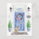 Annoncez votre nouvelle adresse avec notre faire-part élégante avec un chat Ragdoll, une porte d'entrée bleue, un tapis de bienvenue, une ardoise, des topiaires et une couronne fleurie posée sur un arrière - plan en brique grise.