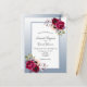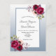 Devant : dégradé bleu foncé avec cadre bleu et blanc poussiéreux. Décoré de fleurs, de roses bordeaux et d'or rose. Modèles pour Vos noms et les détails mariages. Les noms sont écrits avec un script de style écrit à la main, des lettres de couleur grise. Dos : arrière - plan bleu foncé dégradé. Conseil : Si vous ne voulez pas qu'il ressemble à une carte postale, cliquez sur customiser, allez à l'arrière et retirez le séparateur et le timbre postal.