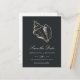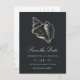 Avertissez les invités de votre prochaine destination, plage, ou mariage d'île tropicale avec ces beaux été enregistrer la date des cartes postales avec une fausse illustration de la coquille de conque de feuille d'or sur un arrière - plan noir souple riche. Élégant script blanc et lettrage de bloc affiche les détails de votre mariage (noms, date du mariage et emplacement) ; utilisez l'envers pour partager des détails supplémentaires comme votre site Web mariage. Les cartes postales sont inversées pour montrer d'autres détails sur la date, y compris votre site Web mariage, avec votre adresse de retour et l'espace pour l'adressage du destinataire, accentué de deux coquillages dorés supplémentaires.