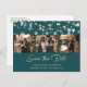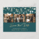 Elégante photo turquoise et mariage d'or personnalisées enregistrer les cartes postales de date avec une police de script moderne. Notre mariage, sauf la date, présente un montage photo de 3 images contre un arrière - plan turquoise orné de lampes à cordes. Personnalisez facilement cette photo enregistrez la carte postale de date avec vos images et les détails du mariage, y compris un site Web mariage, si vous le souhaitez. Pour des demandes personnalisées, envoyez-nous un message.