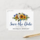 Cartes de sauvegarde de date de mariage bohème aquarelle navy et jaune avec un fond blanc classique qui peut être changé en n'importe quelle couleur, un arrangement floral de tournesol, des plumes et un modèle de sauvegarde de date moderne.