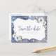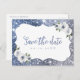 Faux éclat cadre argent et bleu pailleté et "enregistrer la date" écriture avec floral bleu poussiéreux et blanc, élégant et stylé. Grande carte postale pour mariage moderne, mariage romantique et mariage jardin botanique. Voir toutes les pièces assorties dans la collection