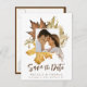 Feuilles d'automne brunes poussiéreuses Élégante carte de mariage rustique d'automne "Save the Date". Jolies, élégantes et modernes invitations de mariage pour votre occasion spéciale ! Parfait pour la belle et apaisante saison automnale ! Une bordure carrée de feuillage de feuilles d'automne brun clair foncé aquarelle et jaune doré avec une variété de feuilles d'érable, de feuilles de chêne et de fleurs séchées encadre le haut de vos détails de célébration de mariage. Vos noms sont mis en valeur dans une police moderne en haut, et la carte est à retourner pour révéler un fond à motif brun foncé au dos. Personnalisez vos détails de mariage, date, lieu et plus encore à l'avant.